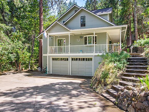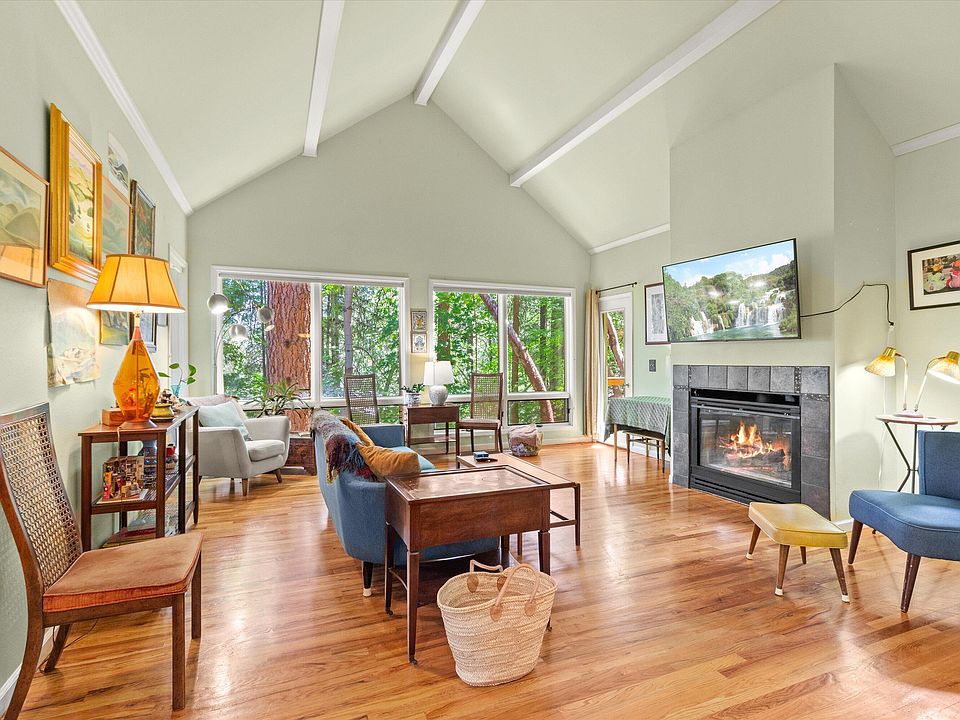Welcome to this stunning home nestled in the scenic Ashland hills. Thoughtfully designed with an efficient layout, this residence offers an inviting open-concept main level, perfect for both everyday living and entertaining. Highlights include beautiful oak hardwood floors, striking wood accent beams, vaulted ceiling in the living room, and new carpet throughout the upstairs and stairwell. The kitchen features Corian countertops with an integrated sink, gas range, and a butcher block island. The main-level primary suite offers generous space and direct deck access through elegant French doors. Upstairs are three additional bedrooms, while the lower level includes a large two-car garage, a dedicated office with bamboo flooring, and ample storage. Recent improvements include new A/C, new roofing, new carpeting, and new decking! With views of the surrounding trees from nearly every room, it's like living in your own tree house.
