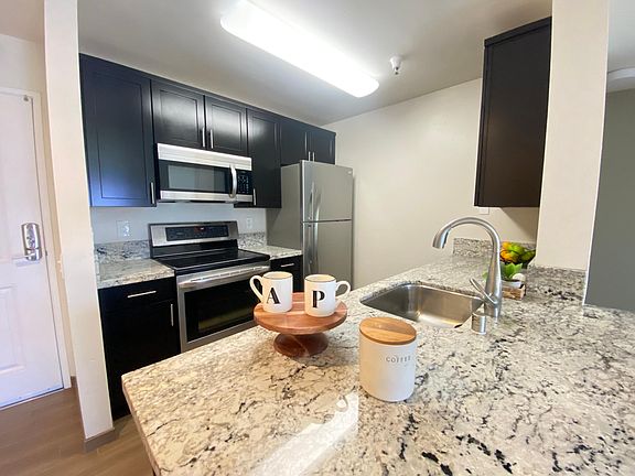 Contemporary styled kitchen features granite counter-tops, stainless steel appliances, range/oven, refrigerator, dishwasher, garbage disposal, microwave, and ample cabinet and counter space. Lots of in-unit storage!