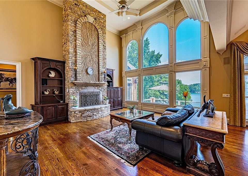 Luxurious Lakefront Retreat on Lake Lanier with Breathtaking Views. Nestled on the tranquil shores of Lake Lanier, this exquisite custom executive sanctuary offers a rare opportunity to experience year-round enchanting sunsets and the ultimate in waterfront living. The stunning 180-degree panoramic view of the lake is a masterpiece in itself, visible from every corner of this home. Step inside to be greeted by a symphony of design and craftsmanship. Magnificent millwork adorns the ceilings, showcasing must-see trey ceilings with intricate decorative accents that catch the eye. The soaring great room, crowned by a majestic stacked stone fireplace, seamlessly flows into the gourmet kitchen and breakfast area. This space isn't just for culinary delights; it's a testament to the art of living well. The master suite on the main level is a private oasis of elegance. The spa-like bath exudes relaxation, while the split double walk-in closet provides ample space for your finest attire. Whether you're gazing out from the large sunroom or enjoying the breeze on the two patios, the clear view of the lake from the house serves as a constant reminder of the beauty that surrounds you. The lower level boasts a self-contained living area, complete with a gourmet kitchen, bedroom suite, and a living area with a fireplace. A grand wrap-around porch invites you to savor the outdoor beauty. Three additional bedrooms on the second level provide luxurious havens for rest and relaxation, each adorned with a touch of sophistication. Outside, a covered deep-water dock beckons for aquatic adventures. With a boat slip and two jet ski ports, every day is an opportunity for lake-bound excitement. Located in a friendly neighborhood close to parks, lake waterpark venues, restaurants, shopping, and top-rated healthcare, this property combines convenience with serenity. Welcome to your own resort-style haven, where luxury living meets lakeside tranquility. No HOA restrictions, a three-car garage, and grand doors 9-10 ft tall add to the allure of this property. This property is GRANDFATHERED in which is why the property has such a stunning view of the lake. Experience the exceptional with this lakehome – a true masterpiece of lakefront luxury living.