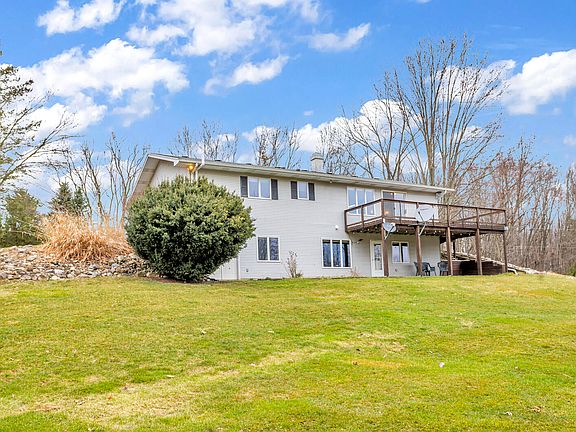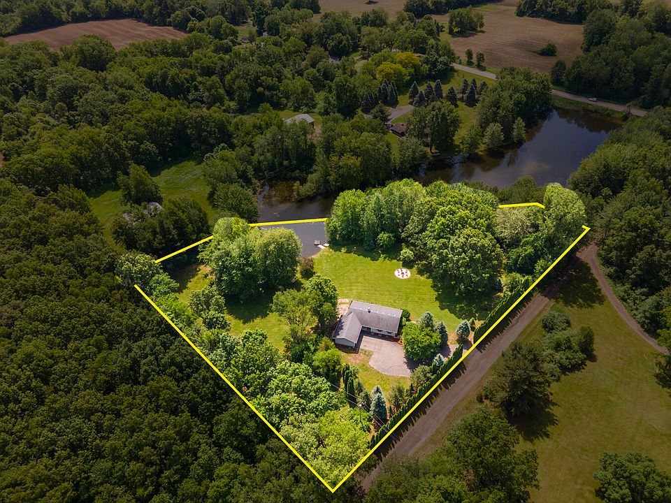 Nestled amidst natural beauty, this picturesque property offers a serene and private living experience. The residence is surrounded by a lush landscape, featuring mature trees and a vibrant array of fruit trees, creating a tranquil and secluded oasis. The property's highlight is its charming waterfront access to a serene pond, providing a perfect backdrop for relaxation and outdoor activities. The expansive 3.4-acre lot, with its diverse flora and vast green spaces, invites the joy of outdoor living, making it an ideal haven for those seeking a connection with nature. The home features 5 bedrooms, 3 full baths, and a total finished area of 2400 square feet across all levels, including a full walk-out basement. Second driveway gives access to 31'x23' Pole Barn with Electrical Service.