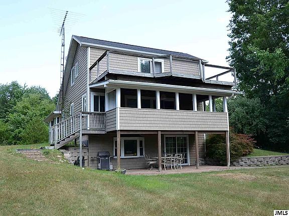 Great potential and a wonderful opportunity! This spacious 3 bedroom, 3 bath home is situated in a private setting on 5.69 scenic acres by Portage Lake, offering the possibility of having a wonderful lake view, Grass Lake Schools! Large foyer, 2 bedrooms and a large full bath with a jetted tub & separate shower are located on the main level. Open floor plan, the great room features a vaulted ceiling and is open to the spacious eat-in kitchen with an island and to the dining area, from there leading out to a large covered porch, down to the walk-out basement and up to the spacious 2nd floor master suite with a large balcony. The walk-out basement also offers great potential with the large patio, kitchenette, rec room, non-conforming 4th bedroom, full bath, laundry room and access to the 2.5 car attached garage. Recently installed heat pump, all appliances stay. Put on your own touches & make it yours!