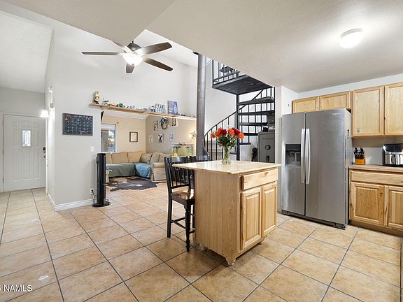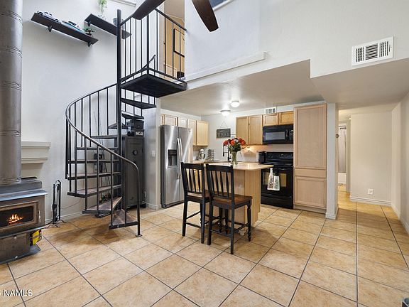 The primary bedroom is conveniently located on the main level with a full bathroom and private access to the fenced yard. Upstairs loft is accessible via a captivating spiral staircase, and has been thoughtfully converted into a second bedroom complete with its own full bathroom. Vaulted ceilings and natural light create an open, airy feel throughout. The laundry area is conveniently located in the hallway on the main level.All of this in an unbeatable location close to NAU, miles of forest trails, the Flagstaff Mall, and superb restaurants. This is a fantastic opportunity you won't want to miss out on