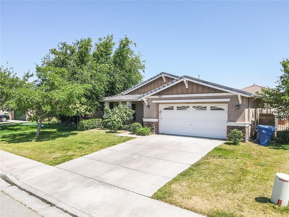 Welcome to this beautiful Palmdale residence boasting 4 bedrooms, 2 bathrooms, and 1,834 square feet of living space. Prepare to be impressed by the stunning kitchen, featuring built-in stainless-steel appliances, an eye-catching backsplash, beautiful cabinets, and an inviting island. The kitchen seamlessly opens up to the dining room, creating a perfect space for hosting and entertaining. The guest bathroom showcases a stylish tile countertop vanity. The bedrooms throughout the home are bright and spacious, complete with ceiling fan/light fixtures for added comfort. The primary bedroom offers a private bathroom with a granite countertop, a soaking tub, and a separate shower. Convenience is at your fingertips with a dedicated laundry room that provides additional storage space. Outside, the property features both a spacious front and backyard. The front yard welcomes you with a lush green lawn, a wide driveway, and an attached 2-car garage. Enjoy your summer evenings in the private backyard, which includes an open patio area where you can add outdoor seating and a BBQ grill, perfect for outdoor gatherings and relaxation. The location of this home is superb, with close proximity to shopping centers, schools, a variety of dining options, parks, and more. Experience the charm and comfort of this Palmdale beauty, offering a wonderful place to call home.