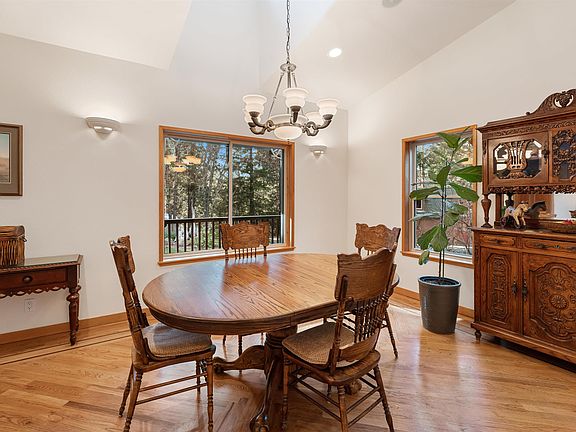 The long, paved driveway beckons you through 5 acres of conifers to the privacy of this stately mountain home. As you arrive at the house via the circular drive you are greeted by soaring trees, beautiful landscaping and a babbling waterfall pond feature on your way to the front door. This 3500sf home features 3 Bedrooms, 2.5 Baths, formal dining room, loft in master bedroom, large bonus room off the kitchen, hardwood flooring throughout main floor, high ceilings with clerestory, transom windows & skylights. The kitchen floor plan is set for entertaining while you cook with custom cabinets, subzero refrig, Dacor dbl ovens, granite counters, kitchen island w/Dacor cooktop & prep sink. There is a breakfast nook, an eating bar plus a formal dining room. Split bedroom design features a large master with loft for perfect office or library. Up a short flight of stairs is a spacious bonus room for pool table, games, workout equip, tv, extra guests and more! Home has a fully integrated generator backup system. Across the drive is an additional 2 car garage with attached shop plus there's a full RV hookup. The adjacent 5 acres on Maple is available on a buyers first right of refusal basis.