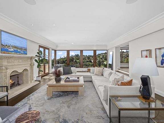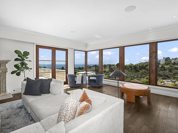 This iconic La Jolla landmark celebrates panoramic sea, sunset, and hillside views from its unique mountainside perspective, and offers an extreme level of luxury and security with vast square footage, magnificent grounds, and an easy access, prestigious hilltop location. Classic architecture has been appointed with modern design elements for a sophisticated aesthetic throughout, easily adapted to your own curated interior furnishings and style. The sleek SieMatic kitchen opens through disappearing doors for dining al fresco while the opposite side of the property offers fantastic outdoor kitchen, barbecue, and gathering areas and expansive lawns, ready for entertaining on an intimate or grand scale. Secondary suites are on the upper level along with a huge recreation room with spectacular views of the picturesque surroundings. With plenty of room for family and friends, this grand residence offers a gracious and warm welcome to all. Magnificent modern updates include a top-of-the-line Siematic kitchen with steam oven. Enjoy indoor/outdoor living with four fireplaces inside, (including the vast upstairs recreation/game room,) and inviting fireplace seating in the private backyard. Welcome guests with plenty of parking within the gates and numerous areas for grand or intimate gatherings. A very special private estate in a picturesque, easy-access setting.