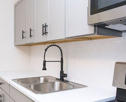 As you step inside, you walk into a cozy living room that effortlessly connects to the kitchen. The kitchen is a stylish spot to prepare meals, featuring sleek grey cabinets, a subway tile backsplash, and stainless steel appliances, including a fridge, range, and microwave. There's a small dining area within the kitchen as well, along with washer and dryer hookups for added ease and practicality.