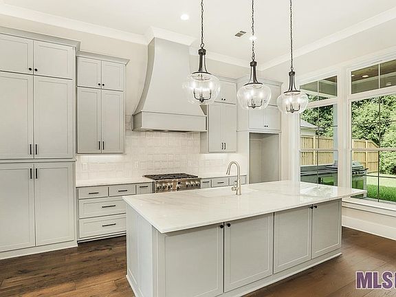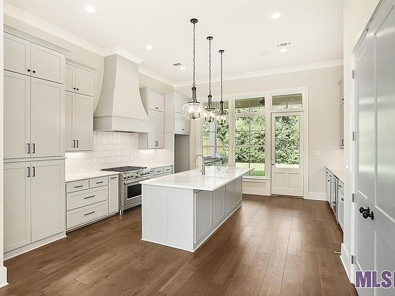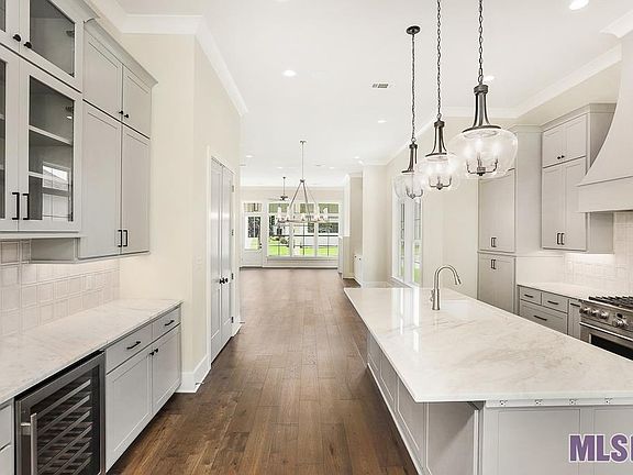 Custom built by Bond Construction, this home is move- in ready, set on an oversized lot with plenty of backyard space within Audubon Square. As you approach this home, the lovely front porch greets and as you enter, you’ll notice a sight line with a wall of windows at the rear of the home, allowing for plenty of sunlight. The fireplace with quartz surround creates a focal point for the gathering room, flanked on either side by custom built-ins. The kitchen features an oversized island with quartz counters, GE Cafe stainless appliance package with gas range, and bar space with wine cooler. The covered back patio is finished with tile and a complete outdoor kitchen. Wood floor begins when you enter the home and continues throughout. Entering the primary en suite, you’ll find a spacious private retreat opening to a bathroom made for relaxing. The owner’s bath has a stand alone tub and glass enclosed shower with custom tile to the ceiling. The owner’s closet offers ample space for all your wardrobe and storage needs. An additional guest en suite with private bath and two secondary bedrooms open to a shared guest bath. This thoughtfully laid out plan also includes an additional half bath and utility room finished with additional cabinets and sink.Come see the green spaces and walking trails and access to BREC's Antioch Park, making Audubon Square a wonderful place to call home. Call today for your private tour of the custom finishes included in this home!