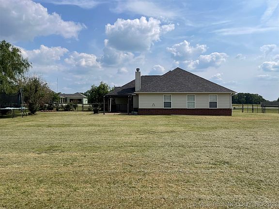 Lovely home w/open kitchen/living/dining, solid surface countertops, lots of cabinets, pan ceilings in living & master, fireplace, well kept home. Newly shingled roof in 2019 and new flooring installed in living room in 2022. Beautiful landscaping and flowerbeds bring color and beauty to this home. Large fenced yard with covered patio. Storage building was purchased in 2020. Conveniently located between Pryor/Claremore!