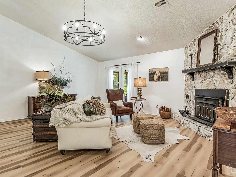 HUGE PRICE REDUCTION! This truly is country living at it's finest! Zoned Rural Residential (Horses, Chickens and Goats welcome!) and situated on a lovely landscaped 2-acre lot, this spacious, split floor plan, 3-bedroom, 2-bathroom home seamlessly combines rustic charm in an organic farmhouse style, offering a perfect retreat for those seeking a peaceful lifestyle. Step inside to discover soaring Ceilings in the Great room, a freshly painted interior and new LVP flooring that flows throughout the whole home, along with Cypress and Cedar accents. The inviting sunroom is the perfect spot to relax and soak in the natural light, overlooking the flowers & trees in the pretty back yard; or curl up on the sofa in front of the newly whitewashed, river rock fireplace with it's wood burning stove. The updated master bath is a true oasis, featuring a refinished jetted tub, new Vessel Sinks and toilet, plus a tiled walk-in shower & 2 walk in closets. The heart of the home is the stunning kitchen and breakfast nook, designed for both functionality and style. It features a new stainless steel stove, hood and dishwasher, distressed birchwood cabinetry, a farmhouse sink and live edge butcher block counters. New high end, custom light fixtures and hardware throughout the home add a touch of modern sophistication and give this home a true farmhouse feel. The attached 2-car, Cedar paneled, side entry garage, a shed and a large 2 story barn with a four Horse stalls and a hay loft, provide ample storage and versatility. The expansive 2-acre lot offers endless possibilities for gardening, outdoor activities, or simply enjoying the peaceful surroundings. This beautiful home offers the best of country living while still being conveniently close to local amenities and only 30 minutes to Downtown Pensacola. New Roof prior to closing! Don't miss the opportunity to make this charming property your own.