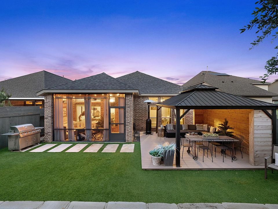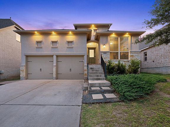 Experience serene luxury hill country living in the prestigious Sweetwater community. This single-story home is fully updated and move-in ready, featuring a private backyard retreat and stylish finishes throughout. Originally built in 2017 with custom modern updates added over the past 5 years, this 4 bedroom, 3 bathroom home is ideal for someone looking for a seamless move-in-ready experience. Stunning custom landscaping welcomes you upon arrival, complemented by a two-car garage and an updated modern front door with keyless entry. Inside, the luminous open floor plan connects a contemporary island kitchen, dining area, and sunlit living room, all under high ceilings with wood-look tile flooring, recessed lighting, and fresh paint. A custom accent wall in the living room frames a designer electric fireplace with a recessed niche for your TV. The kitchen shines with desirable modern finishes including granite countertops, stainless appliances, bar seating, and under-lit shaker cabinetry with modern hardware. The peacefully secluded primary suite overlooks the backyard and includes a spacious ensuite with dual vanities, a soaking tub, walk-in shower, and huge walk-in-closet. Three additional bedrooms are thoughtfully placed—one with its own ensuite bath, and two others sharing a guest bath. A charming mudroom with built-ins sits at the garage entry. Enjoy outdoor living at its finest with a gorgeous screened-in back porch, extended patio with cabana cover, and a gently terraced backyard with low-maintenance turf and full privacy fencing. Sweetwater residents enjoy access to top rated Lake Travis ISD schools and a vast array of community amenities including pools, a clubhouse, tennis courts, fitness center, outdoor recreation, and more. Conveniently located just off Hwy 71, with nearby shopping, hill country destinations, and only 21 miles to Downtown Austin. Your dream hill country lifestyle aways - schedule a showing today!