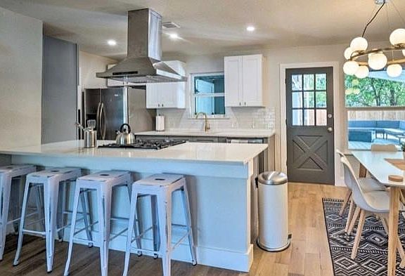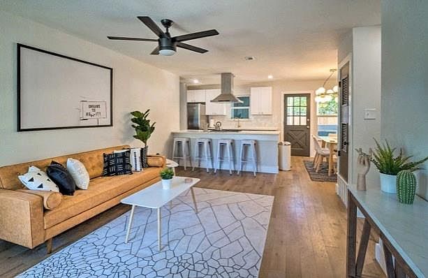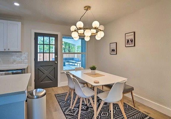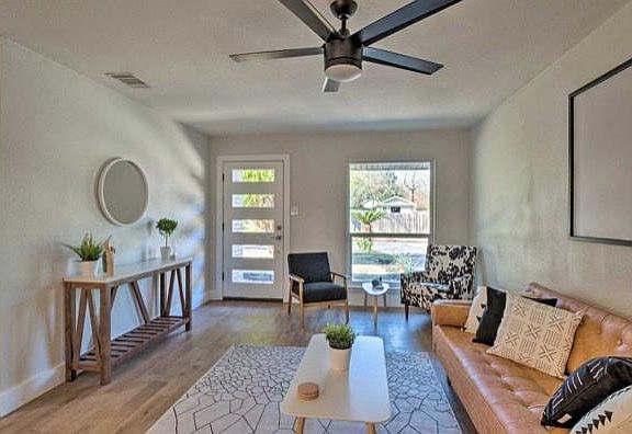 Modern mid-century beauty features gold fixtures and custom, chic finishes. Oversized windows, vibrant and muted colors. Wood flooring throughout the home. Bathrooms complete with white and ceramic tile flooring. Custom backsplash, recessed lighting, stainless steel appliances and recessed panel cabinetry. Adjacent suite with own separate entrance. Backyard covered deck. New HVAC, roof, back landscaping, smart thermostat, smart lock, security system. Modern American ranch furnishings also available!Guest Accommodations: Yes Restrictions: Yes Comm. Features: Health Club Discount