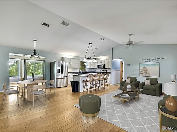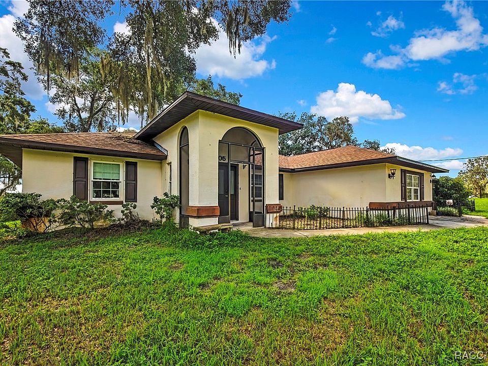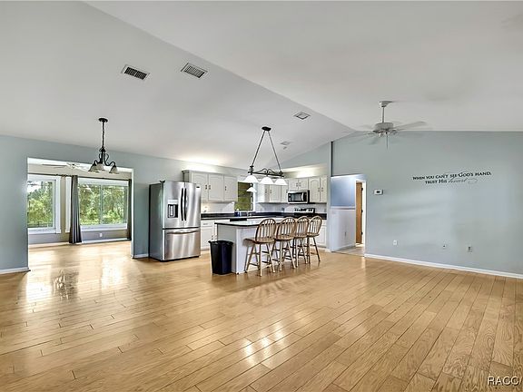 One or more photo(s) has been virtually staged. This home is everyone's answer to peace and tranquility. If goats or horses are your fancy, you have the room for them on this 11 acre farm. This cozy 3-bedroom, 2-bath home is tucked away on 11 acres under majestic oaks. It’s a perfect blend of peace, privacy, and pure Florida living. Stainless steel appliances in the open kitchen. Imagine looking out your kitchen window at that expansive property.... This big open concept living area with kitchen only needs a few updates to fancy her up but she has strong bones and well built. Not too far from the chain of lakes. Nice big beautiful windows overlooking the land. There are 2 virtually staged photos only. The propane tank is rented.