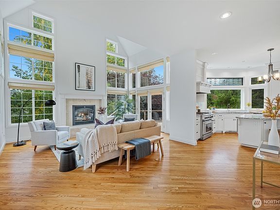 Sought-after Holmes Point estate, featuring Lake Washington views, soaring 10’ & 25' ceilings, and 2,910 sq ft of elegant living space. Positioned on a private 16,864 sq ft corner lot, this 3 bed/ 2.75 bath, main home offers a flexible floor plan, abundant natural light, & high-end finishes throughout. Primary bed includes en suite 5-piece bath & private balcony. Expansive west facing deck & patio overlooking lush landscaping. Detached 2-car garage includes DADU/upper level studio, finished with kitchen & ¾ bath. Equipped with standby gas generator, and central AC throughout. Rare opportunity in a prime location, with easy access to waterfront, parks, trails & boat launch in Lake Washington School District!