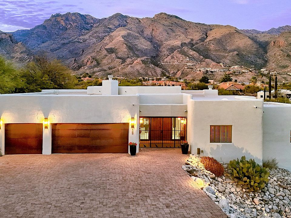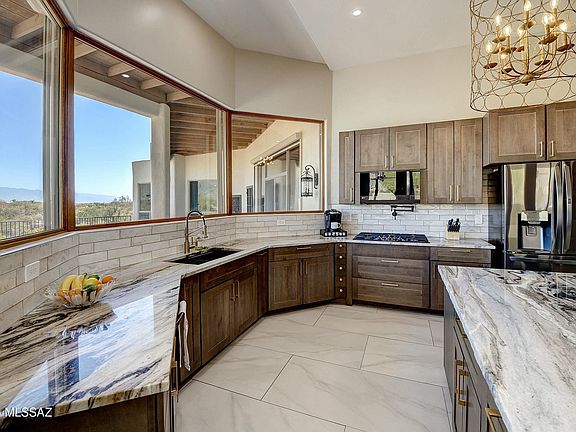 Views, Views, Views! Experience luxury living in this stunning contemporary home, perfectly situated on a private acre lot to capture the breathtaking views of the Catalina Mountains, Rincon Mountains, Mount Lemmon and even a peak of the Tucson city lights. This architectural masterpiece blends modern elegance with the natural beauty of its surroundings, creating a home that is both stylish and serene. Natural light, high ceilings, and oversized windows flood every room, enhancing the open and airy feel of the home. The modern kitchen is a chef's and entertainer's dream with high-end appliances, double oven, a spacious island, and sophisticated finishes. It opens to a large great room with an unobstructed mountain view. The split floor plan offers privacy and functionality with generously sized bedrooms, including a luxurious primary suite. Three fireplaces add warmth and ambiance, while spa like bathrooms offer the ultimate in relaxation.