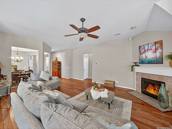 Welcome Home! This beautiful one-story home offers an open and inviting floor plan with wood floors flowing through the family room, dining room, and all bedrooms. The spacious family room features a cozy fireplace and seamlessly connects to the kitchen, which boasts granite countertops and a lovely view of the cheerful backyard. Both bathrooms offer granite countertops, and the primary bath includes a recently remodeled walk-in shower. The outdoor living area includes a vaulted, wood-lined covered patio, outdoor kitchen, hot tub, soothing water feature, and low-maintenance artificial turf. With green space behind the home and a north-facing backyard, you'll enjoy comfortable mornings and afternoons year-round. Additional updates include a roof replacement in 2019 and HVAC system approximately 6-7 years old, plus a water softener and a reverse osmosis water system providing peace of mind for years to come. This home truly combines comfort, style, and an entertainer's dream backyard-don't miss it!