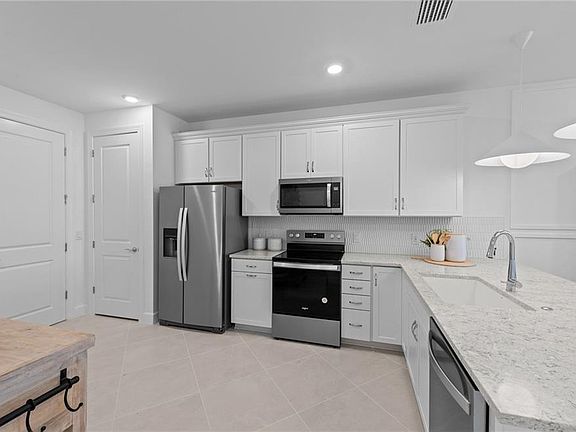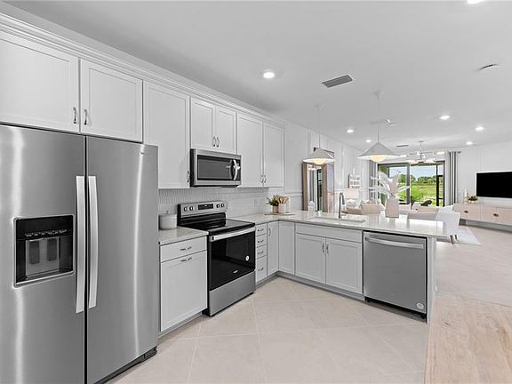 Resort style poolCovered lanaiQuartz countertopsStylish kitchen backsplashTile flooring throughout homeStainless steel appliancesWhite kitchen cabinets