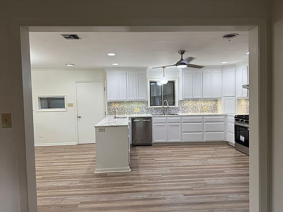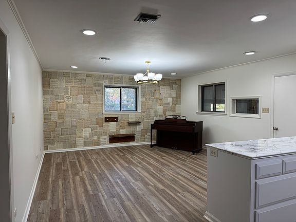Unique wall accentsBonus roomRenovated brick homeNew appliancesOpen kitchenDining roomStylish pink chandelier