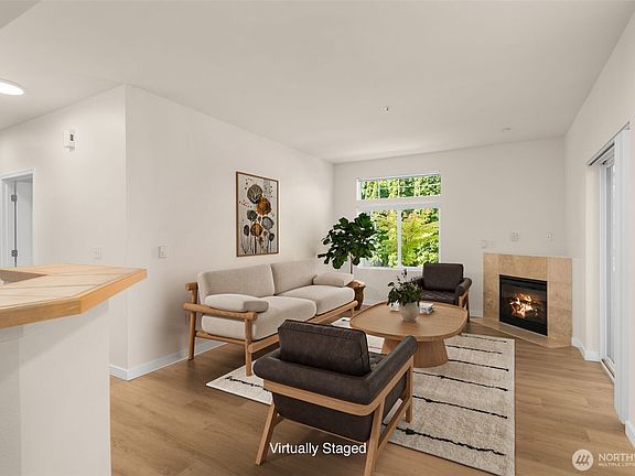 Move-in ready with fresh paint and brand new LVT flooring throughout (no carpet) at this immaculate corner end unit! Enter to living room with wonderful natural light, cozy fireplace w tile surround & slider to patio. Open design kitchen: wood cabinetry, new fridge, newer range & microwave. Fantastic layout w/two bedrooms including generous Primary Suite can fit a king sz bed, walk-in closet, it's own full bath: double sinks & oversized soaking tub. Head down the hall to the Guest Bedroom, new hallway bath w new custom walk-in glass shower w rainhead, & laundry in-unit. Popular Carrara at Lakeland, and easy one-level living. Detached garage parking. Community w/parks, Clubhouse. Enjoy an active Lakeland lifestyle!