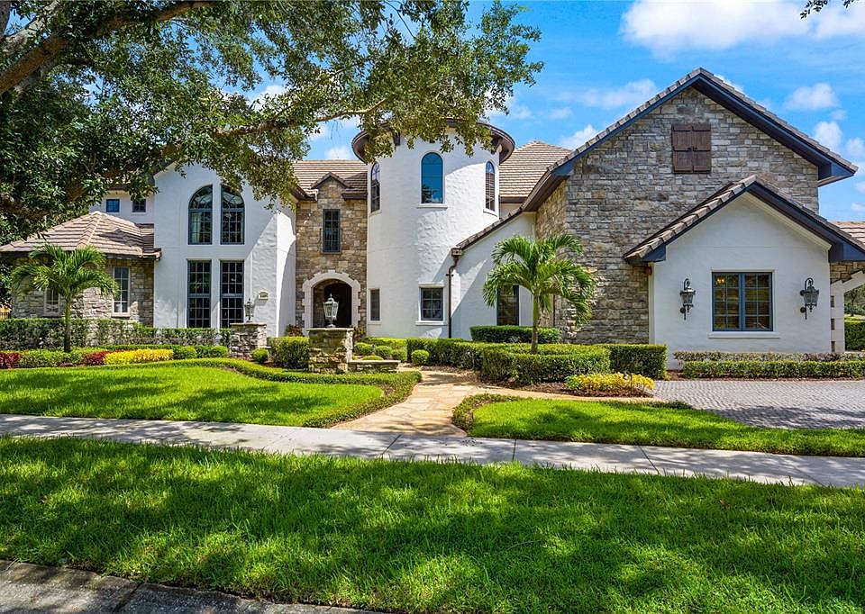 This Custom French Chateau is a one-of-a-kind dream home, built using the highest quality materials, finishes and extraordinary craftsmanship throughout. This home is situated on a private corner lot on the Golden Bear Club in Keene's Pointe with 270 degrees of amazing Golf & Water Views. Boasting over 8000sf in living area, the bottom floor has a Master Suite fit for a King - complete with fireplace, two story walk through closet, washer/dryer, Miele coffee bar & refrigerator, jetted tub, walk-thru shower and Sauna. There are 5 additional bedrooms upstairs. The gourmet kitchen has a gorgeous brick-arched ceiling, custom cabinetry, beautiful granite, huge walk-in Pantry, and top of the line Viking/Miele appliances. Off the kitchen, there is a large wine cellar & tasting room. The Great Room has an aged wood ceiling, custom entertainment center & fireplace. There is also a stunning two-story Mahogany Library & Office with leather ceiling & ornate woodwork. Upstairs includes a Billiards Room with a vintage imported European stained glass antique Bar, Copper Ceiling and Home Theater with tiered seating, rumble seats and automated A/V system. Complete safety system including a safe room, fire suppression & lighting rods. Resort-Style, free-flowing pool & spa with incredible golf and water views. Summer Kitchen, stone fireplace and extensive outdoor woodwork and lighting make this the perfect entertaining home. Recently added a 350sf Custom Home Gym.