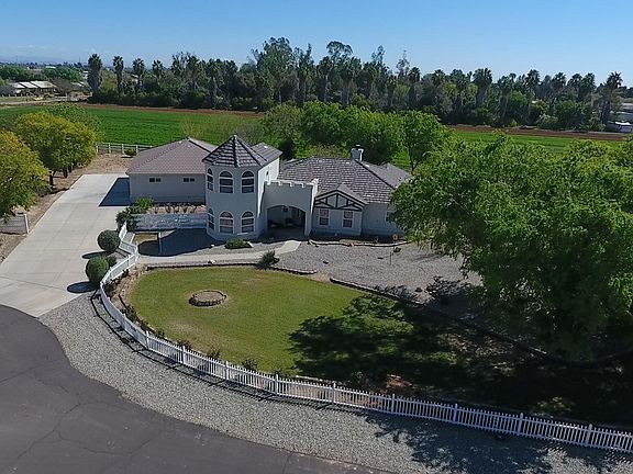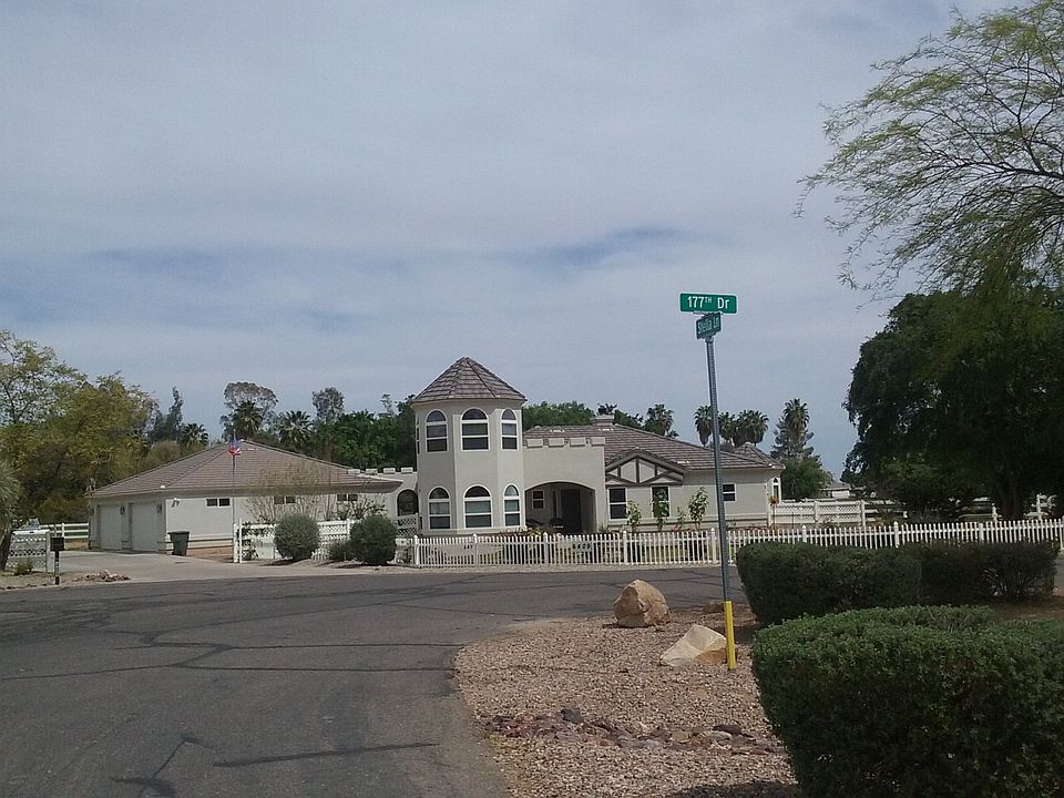 PURCHASE A LIFESTYLE -WITH THIS ACRE+ LOT & IMMENSELY CHARMING HOME . MAIN HOME IS 2473 sf w/3 bdrm/2ba & GUEST HOME IS 635 sf w/1 bdrm/1ba for a total of 3108 sf. Looks like a castle-but much more comfortable & functional), offering peace & tranquility, with mtn views, lush green surroundings, roses, fruit trees, & the option of having your own horse ranch or farm with chickens, cows, llamas, etc. Need a guest home? Got it, with a kitchen, bedrm, living rm and bath. Need a 4car garage? Got it! Need a place for the kids to run & play? Got it. Need a relaxing jacuzzi tub at the end of the day? Got it. Need a lrg kitchen for baking or entertaining? Got it. Need a large family room + a formal dining room? Got it. Click on the more tab view more amenities and details. Main Home is 2473 sq ft with 3 bedrooms, guest home is 632 sq w/1 bedroom and 1 bath for a total of 3108 sq ft . All 2x6 construction Detached garage is total of 1682 sq ft. 1,047 sq ft is the 4 car garage w/expoxy flooring, 220 outlets, workbench 635 sq ft is the guest house & is attached by a breezeway and covered patio. Kitchen has breakfast bar, stainless steel appliance pkg including refrigerator & hot water on demand Large family room has a cozy fireplace & lots of windows. Formal dining room has lovely bayed window bringing in lots of natural lighting. Master suite boasts a wonderful walk-in closet with professional organizers, a jacuzzi and outside entry to patio. 3rd bedroom is the only room on the upper level and has a view deck. (Great for star gazing). Would also make a perfect office, play room, library. Inside laundry room comes with washer/dryer, has on demand water heater and outside exit. Property is zoned for agriculture, you can have 5 large animals (horses, cows, llamas, ten chickens, but no pigs. Property is irrigation and has large shade trees, rose bushes galore, fruit trees such as asian pear, lemon, orange, tangerine. Guest house is attached to garage and has a kitchen w/stove & refrigerator (can very easily add sink), a bedroom, living room w/separate entry & a bath. Great location, you can enjoy country living without sacrificing convenience as home is located close to schools, the 303, I-10, Cactus league baseball stadium, wildlife zoo, etc.