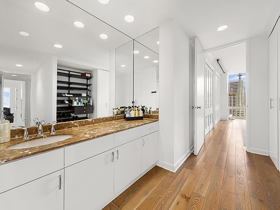 The primary bedroom is designed to impress, with floor-to-ceiling windows offering panoramic vistas of St. Patrick's Cathedral, Fifth Avenue, Saks, and the Empire State Building. It includes two cedar-lined closets and a spacious dressing area with generous built-in storageideal for a fashion enthusiast. The en-suite primary bath is clad in marble and features a soaking tub, separate shower, and dual vanities.