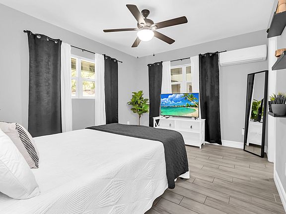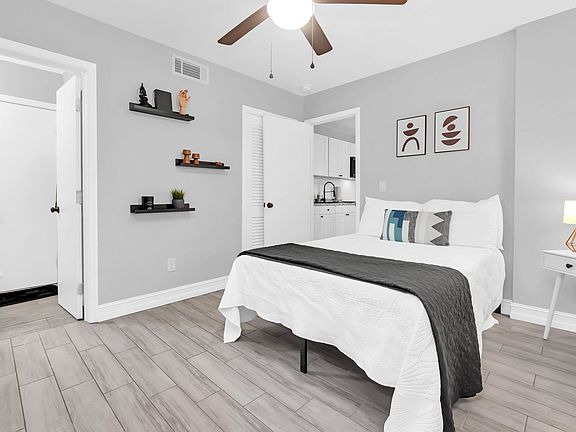 Abstract artPlush grey love seatCeiling fanCoffee stationFully-equipped kitchenCrisp white linensStainless-steel appliances