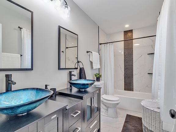 Master bedroom's en suite bathroom comes with a double sink vanity and beautiful white tile complimented with black finishes. Bedroom 2 has an en suite with a modern vanity and large white mirror. Please don't worry about bringing shampoo, conditioner, and body wash. We're happy to provide these toiletries for you!