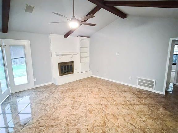 Built-in shelvesWood beamsLarge backyardWood-burning fireplaceBuilt-in microwaveCeramic tileTwo walk-in closets