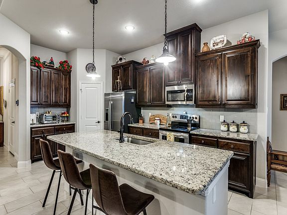Open floor planGranite countertopsLarge kitchenCovered patio with fireplaceDecorative ceiling beamsLarge islandWalk-in pantry