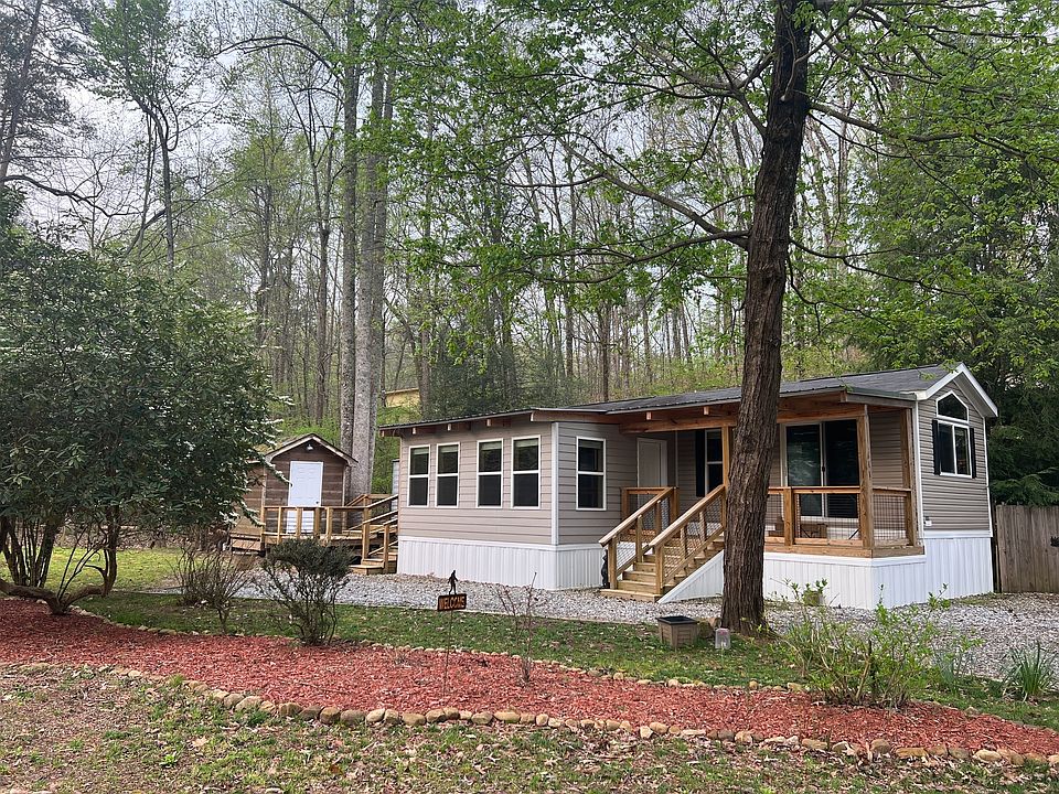 A great location to live full-time or use as a weekend retreat in a lovely, quiet RV park located on the Chattahoochee River, close to Helen and the North Georgia mountains! This nice all-electric park model is located on one of the larger lots in the park and backs up to a wooded area which adds to its loveliness and privacy. It's only a few steps away from the Chattahoochee River where you can fish, kayak, or enjoy hiking in the nearby mountains! Many improvements were completed over the last two years, including a 13' X 18' addition, a cute front porch, and a large rear deck. New appliances include a microwave and a full-sized dishwasher. The HVAC is only three years old, with new duct work and insulation. The property includes two detached buildings: a remodeled shed that contains washer/dryer hookups, and another large 10' X 16' shed. Great neighbors, beautiful seasonal colors, privacy, and high-speed fiber optic internet is installed and ready for service!