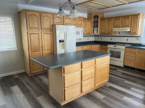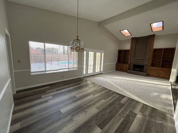 New paint and Luxury laminate waterproof faux wood flooring. 3bd, 2ba 1913 sq. ft. home with POOL!Close to the front gate. The kitchen has an island, built-in microwave, double wall oven, and open family room. Both the living room and family room have gas fireplaces. The dining room is open to the living room. The living room has a huge brick fireplace and French doors leading to the fireplace. There's carpet in the living room and three bedrooms. The primary bedroom has French doors to the patio, skylights, a walk-in closet, and en suite. The primary bathroom has a stand-alone shower. Separate vanity is located just outside the bathroom entrance. The guest bathroom has a tub and toilet, separate from the vanity, which is also located just outside the guest bathroom. Indoor laundry just off of the garage, electric washer/dryer hook-ups. Evaporative cooling, and forced air heating. A refrigerator and built-in microwave are provided. The fridge is not warranted. Tenants responsible for landscaping.POOL SERVICE PAID BY OWNERS! Copyright Ridgecrest Area Association of Realtors. All rights reserved. Information is deemed reliable but not guaranteed.