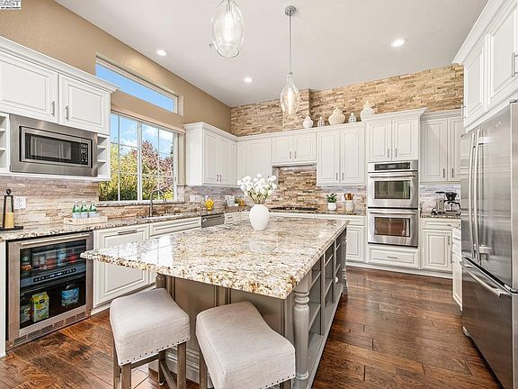 Welcome to 641 Varese Court, a beautifully appointed single-story home in Pleasanton’s prestigious gated community of Ruby Hill. Located on a quiet court, this 5-bedroom, 4-bathroom home offers 4,027 sq ft of comfortable, elegant living. The living room features a tiled fireplace and French doors to the backyard. The dining room includes engineered hardwood floors, crown molding, and recessed lighting. The open kitchen boasts a large island with bar seating, a Jenn-Air 5-burner gas range, stainless appliances, a Butler’s pantry with wine fridge and wet bar, and a walk-in pantry. A built-in desk and bright breakfast nook create a perfect family hub. The family room includes a stacked stone fireplace and media center. The luxurious primary suite has French doors to the patio and a spa-like bath. Three additional bedrooms and two bathrooms (one recently updated) are on the same wing. A fifth bedroom and full bath offer privacy for guests. The backyard includes a spacious patio, built-in BBQ, and lawn—ideal for entertaining. Enjoy Ruby Hill amenities: gated security, pool, fitness center, tennis, and more. Optional golf club membership available. Open House Saturday/Sunday 10/11 and 10/12 1-4pm.