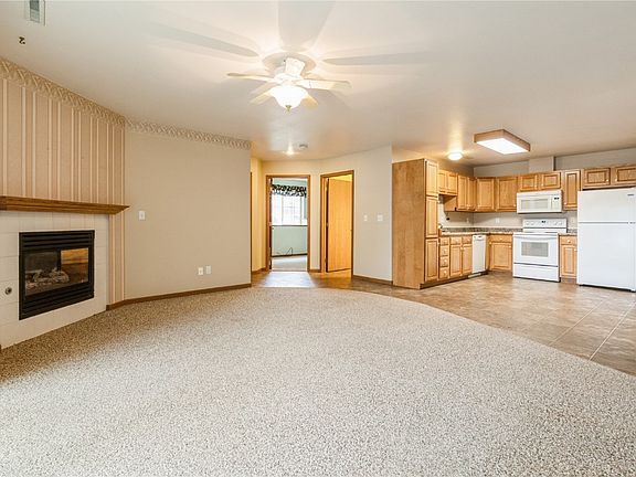 This desirable end unit is filled with beautiful natural light and features two bedrooms—one of which can easily serve as a den, complete with custom oak built-ins. The spacious, recently updated bathroom includes a step-in tiled shower with handicap-friendly features and tile that extends all the way to the ceiling. The kitchen offers abundant cabinet space with custom pull-out drawers, clean white appliances, and a convenient closet with a stackable washer and dryer. The front living room is highlighted by a charming built-in corner gas fireplace (serviced every two years) and a large newer sliding door that opens to a relaxing patio. The thoughtfully landscaped patio area is adorned with red-and-gold daylilies, purple irises, variegated hostas, and a lovely almond bush. Best of all, the garage is just a few steps from your unit—adding to the convenience of single-level living. This is a fantastic opportunity to own a main-floor condo that has been loved, well-maintained, and tastefully updated over the years.