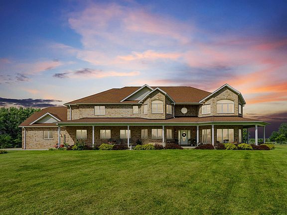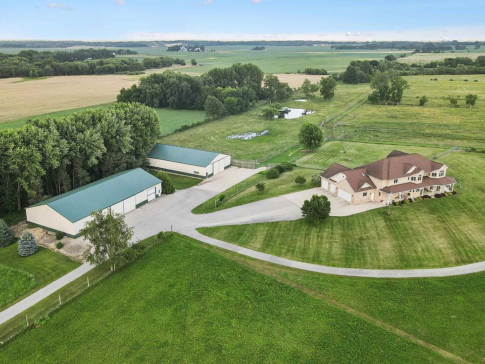 Located on nearly 20 acres, this beautiful two-story home offers over 6,000 square feet of finished living space. The main floor includes a family room with a brick fireplace and patio access, a large kitchen with ample storage, an eat-in area, and a formal dining room. Adjacent to the dining area is a great room with vaulted ceilings and a fireplace. The main level also includes two offices, one full bathroom, one half bathroom, a laundry room and a suite with its own living area, a spacious bedroom, and a full bath. Upstairs, each bedroom has a private bath. The primary suite features a fireplace, attached bathroom with two vanities, a jetted tub, a walk-in shower, and access to an additional room that could be used as in any way it is needed. A separate bedroom on the upper floor is attached to an additional living area. The unfinished lower level includes a bathroom and more than enough storage. Outside, there is a four-stall attached garage with secondary access to the home, plus three Morton buildings. These Morton buildings can be used in a variety of ways from taking care of livestock, storing campers and other vehicles, or being used as a space to run your business in the heated office attached to one of the buildings. The 20 acres is expansive and allows for recreational activities or any sort of livestock to graze. While the house is being offered at 20 acres at this time there is additional land that could be included in the sale. Ask your agent for more details! Final exact acreage is dependent upon an official survey after an offer has been accepted.