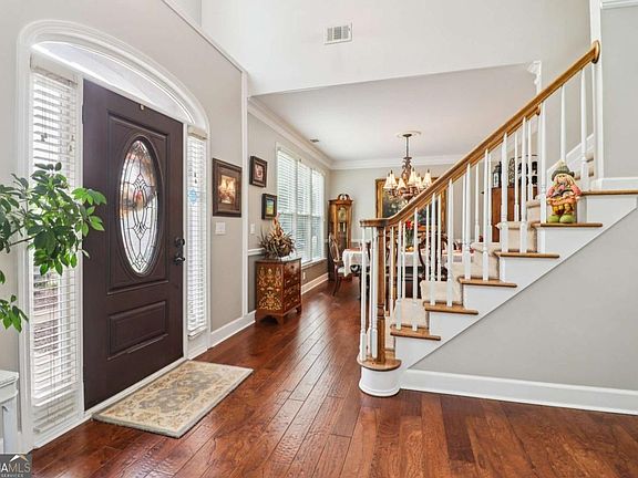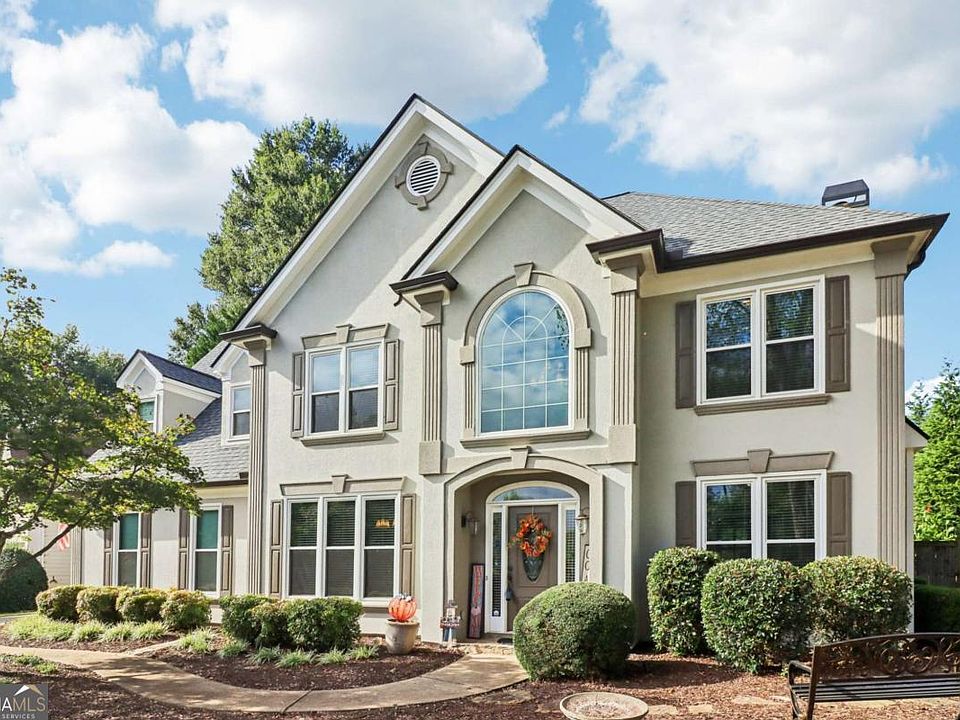 Beautiful home with bright, open spaces throughout! Step inside to find a formal dining room with crown molding and chair rail on the left, and a formal living room on the right-perfect as a home office-connected to the family room by French doors. The spacious family room features a wall of windows with plantation shutters, custom built-ins, and a cozy fireplace. The on-trend kitchen features quartz countertops, tile backsplash, an island with breakfast bar, stainless steel appliances including a double oven, and a sunlit breakfast room overlooking the private backyard. A laundry room and half bath complete the main level. Upstairs, retreat to the oversized primary suite with tray ceiling and sitting area with fireplace, the perfect spot to cozy up with a good book! The spa-like en suite bath includes dual sinks in a granite topped vanity, an oversized frameless glass shower, soaking tub, and a huge walk-in closet. Three additional bedrooms and a full bath provide plenty of space for everyone! The fenced backyard is designed for entertaining with a covered pergola, large patio for grilling, paver patio with a permanent fire pit and a fountain feature, 2 storage sheds, and lots of green space. Don't miss the landscape lighting in the front! Community amenities include Country Club, full 18-hole golf course, 2 pools, 14 tennis courts, gym, park/playground, and direct/private greenway access from the neighborhood. Don't miss your opportunity - book your tour today!