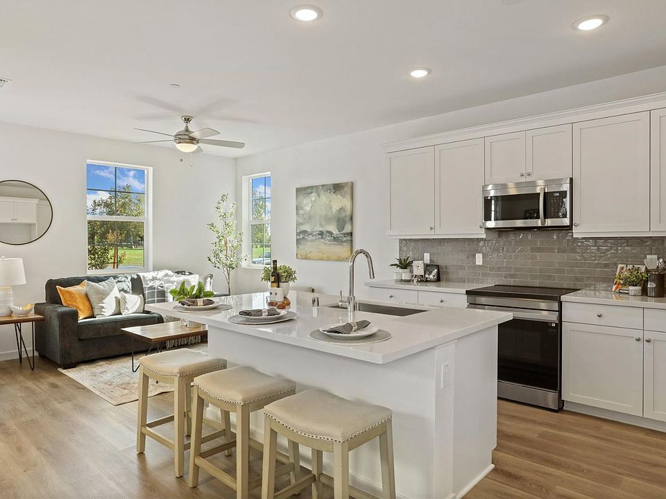 Low-maintenance fully landscaped backyardModern flairSleek black finishesGlam taupe accent backsplashCosentino white quartz countertopsSpacious open-concept floor planElegant winter white cabinetry