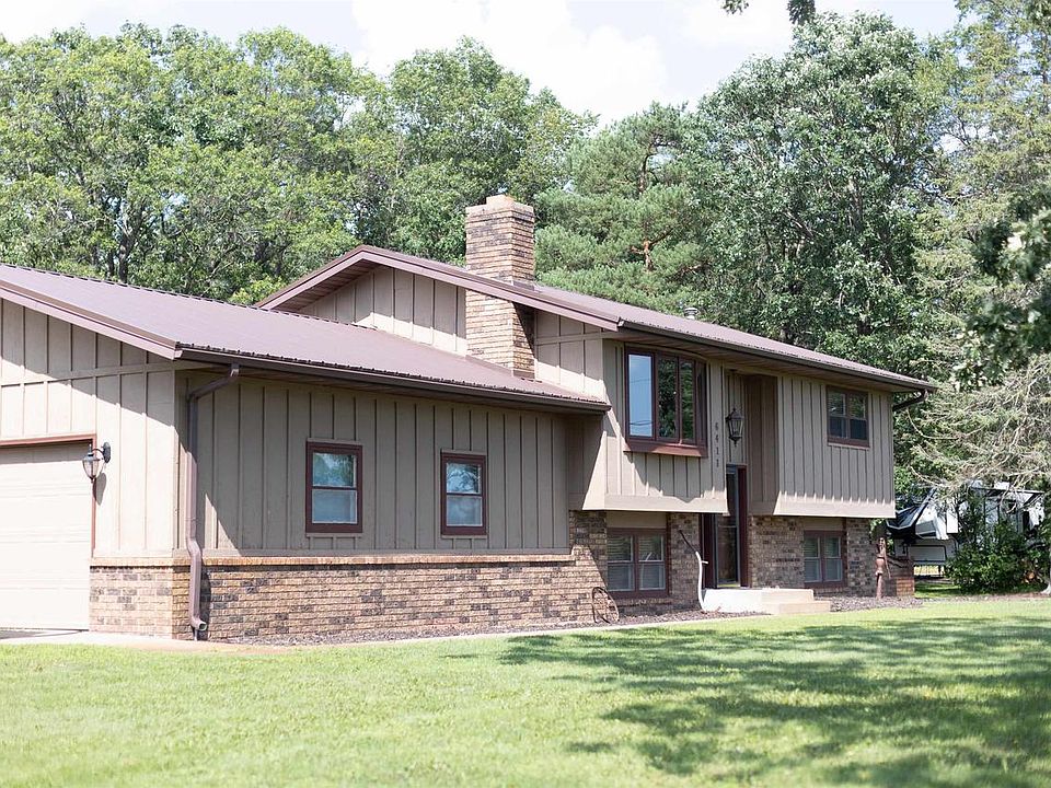 Charming 3 BEDROOM, 2 BATH split-level HOME ON 2 ACRES with attached, insulated 2 car garage and large utility shed. Wood burning fireplace, plenty of closet space, jacuzzi style bathtub, and rear deck overlooking a secluded yard. Property INCLUDES 4 CAR INSULATED OUTBUILDING (on private 2nd driveway) with covered patio and pull-through RV pad with 30 and 50 amp electrical service. MOVE IN READY. Fifty year metal roof on both the house and outbuilding. New A/C unit as of 2024. Close to Lake Wazeecha beaches and trails.