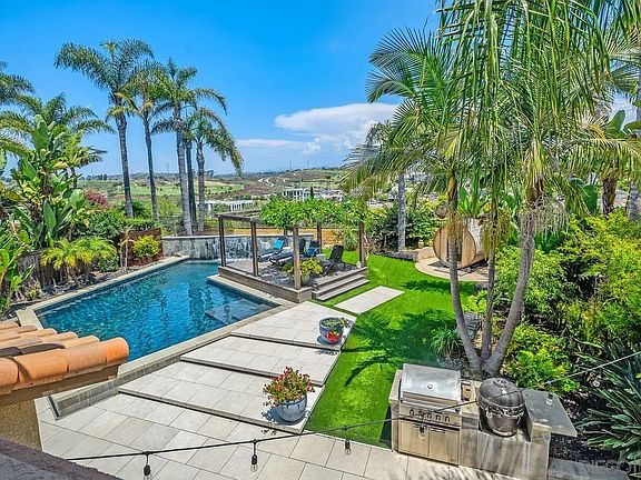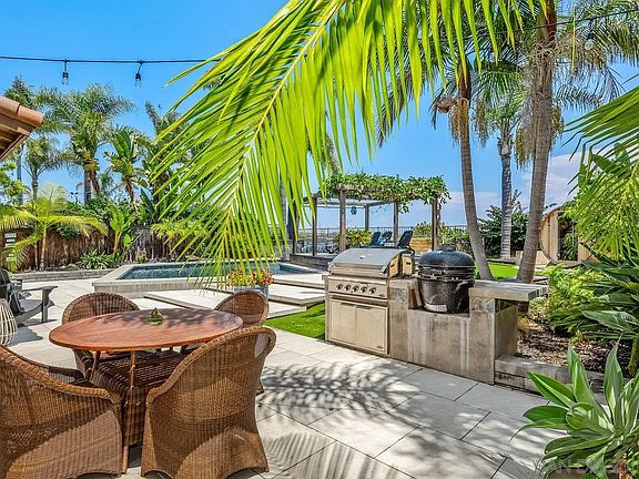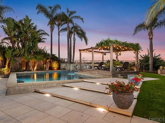 Discover your dream home nestled in a peaceful cul-de-sac in Seabright, boasting an elevated lot with breathtaking views. This rare find offers a resort-inspired backyard and a separate 1 bed, 1 bath ADU with its own entrance, full kitchen, and private garage—perfect for guests or rental income. Backing to a serene canyon, the property ensures ultimate privacy and picturesque views. Inside, a full bed and bath on the main level provide convenience, while the backyard is an entertainer’s paradise. Dive into the 2 year old black bottom pool, relax on the custom Ipe hardwood deck, or fire up the high-end DCS built-in BBQ and Green Egg smoker. Imported Italian outdoor tiles, and a luxurious Almost Heaven barrel sauna complete the outdoor oasis. The chef’s kitchen includes upgraded cabinetry, a spacious breakfast nook, standalone island, 6-burner stove, KitchenAid appliances, and an oversized walk-in pantry. Upstairs, the expansive primary suite offers stunning views of The Crossings Golf Course, mountains, and evening lights. The spa-like primary bath features a soaking tub with panoramic views, a large shower with new tile and glass surround, and a XL walk-in closet with custom shelving. Seamless indoor/outdoor living is yours with bi-folding La Cantina doors, perfect for enjoying Carlsbad’s ideal coastal weather. Located within walking distance to Pacific Rim Elementary, Poinsettia Park, and just minutes from the beach. Plus, enjoy ultra-low electricity bills with Tesla Solar and smart home features such as a Nest thermostat with dual zone heating & AC for energy efficiency