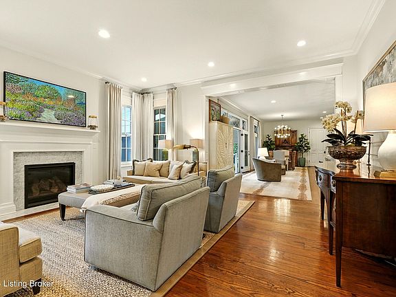 Inside, the open floor plan is filled with natural light and timeless details. A spacious living room flows into the dining area and chef's kitchen, featuring an oversized island, marble countertops, subway tile backsplash, stainless appliances, beverage refrigerator, and walk-in pantry. Millwork and finishes throughout are exceptional: wide hand-finished pine floors, tall ceilings, solid two-panel doors, crown moulding, and a classic fireplace surround.