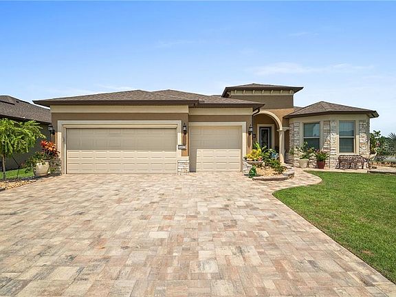 The view of the Lake and Golf Course will last but the opportunity to own this extended, custom Pinnacle featuring 3 bedrooms, 3 baths, den and 3 bay garage will not. On an oversized corner lot, the home has a rounded stone entryway leading to an 8' stained glass front door, type 3 elevation w/additional stone work, stacked stone/paver hardscape all around, roll up garage screen, full gutter wrap, French drains, a 12' x 24' insulated patio roof w/ shingles, screen walls and pavers to the rear - all designed for maximum curb appeal. Interior features a breathtaking neutral pallet w/24" porcelain tiles, high-end manufactured wood flooring, glass panel French doors to the den, 2 panel Cheyenne doors and upscale window dressings throughout. The gourmet kitchen surpasses anything found in the design center with custom quartz counters, 42" soft close cabinetry (finished with 12" lighted display cabinets and crown molding to the ceiling), high end Samsung 4-door refrigerator, Bosch Appliance package, copper farmers sink/faucets, glass pantry door, under counter lighting, pullouts and more. The spacious master features plank flooring, pocket door to the master bath w/Roman shower, custom cabinetry, lighting and a walk-in closet/dressing room equipped with cabinetry, drawers and chandeliers. All baths are finished in porcelain flooring, granite tops and have porcelain tiled shower/tub areas w/listello. The zero entry 19 x 13 ft lanai has a triple pocket slider and 24 x 12 roofed extension with screen, all finished in pavers. Connecting house to garage is a large laundry room with ample cabinetry, utility sink and counter for folding, garage is equipped w/cabinetry, a Kinetico water treatment system and high efficiency hot water heater. For those who want the best Stone Creek has to offer, this is a must see.