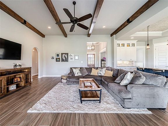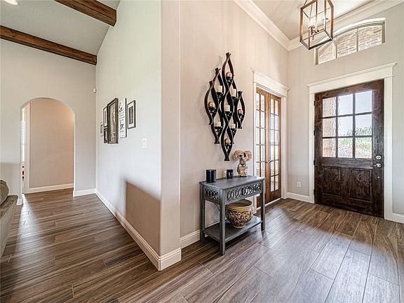 Country Living at its Finest at the Exclusive Starlight Ranch Estates! This lovely custom home offers you an open concept floor plan with beamed ceilings,custom wall moldings,craftsmen interior doors and other designer touches. The gourmet kitchen has a huge center granite island, tray ceiling,gas stove, farm sink,double oven, stainless steal appliances and fine custom cabinetry. The master bdrm offers a tray ceiling, a luxurious tub, separate shower, double vanities and a huge walk in closet with built in cabinetry. The study can be a 5th bdrm. The craft room is also a storm shelter. The house is foam insulated. The big BONUS in this house is its almost 1.5 acre lot, one of the biggest in the subdivision!