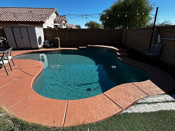 Family two-story home in Phoenix just down the street from school. Backyard features a covered patio, firepit, and sparkling PebbleTec pool. Store your pool supplies and yard tools in the backyard shed. RV gate and pad for convenient parking. Vaulted ceilings in formal living and dining rooms and custom color palette throughout. Wood floors in upper level master suite and secondary bedrooms. Ceiling fans in every room. single sink vanity. Kitchen is complete with granite and custom cabinets. Close to all major valley freeways