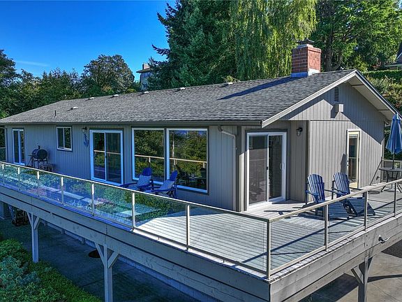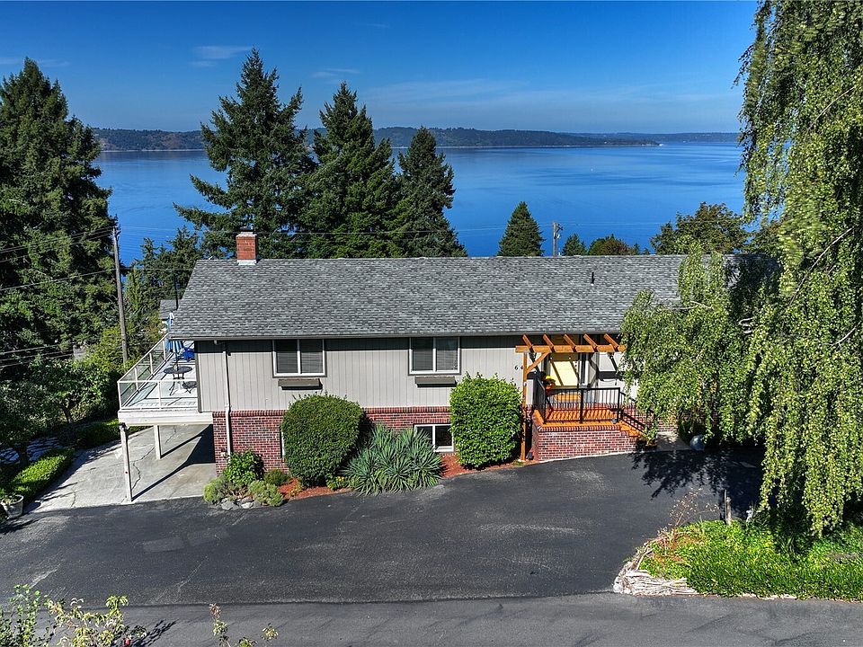 Enjoy sweeping views of Puget Sound & the Olympic Mtns from this 4BR/3BA custom NW contemporary. Nearly every room frames the stunning scenery, featuring an expansive 1,100 sq ft deck, a covered breezeway, terraced gardens with multiple private sitting areas, fruit trees, and quiet seclusion throughout. Inside, updates include new paint, quartz counters, and hardwoods. Laundry upstairs and downstairs. The open layout features a wet bar, fireplace, & workshop with a concrete floor—luxurious 5-pc primary bath w/large walk-in shower. There is an opportunity to convert the downstairs to an ADU with its own laundry. Comfort year-round w/heat pump, A/C & HEPA filtration. Ample storage w/4-car garage & carport.A private retreat to call home!