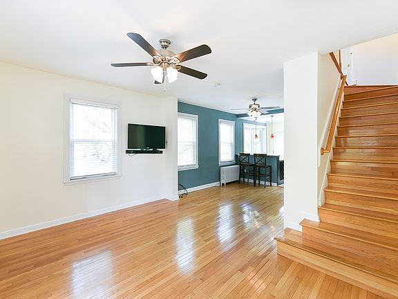 This three-bedroom, one-bath home blends historic charm with modern renovation, and has a newly updated kitchen with cherry wood cabinets, hardwood floors, and freshly painted interiors. Large windows fill the home with natural sunlight throughout the day. All three bedrooms are located upstairs, while the main level has spacious living and dining areas that connect seamlessly to the open kitchen.