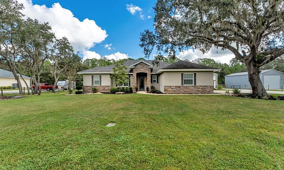 Escape the hustle and find your perfect blend of serenity and sophistication in this like-new home nestled on nearly 5 acres of picturesque land and tucked into a gated community. Built less than 6 years ago, this property is the ultimate retreat for those who love to entertain, relax, and enjoy Florida living at its best. Step inside to an open-concept floor plan featuring 3 spacious bedrooms, a bonus room, and 2 beautifully appointed bathrooms. The split-bedroom design offers privacy and comfort, while the main living area seamlessly connects to the outdoors—ideal for hosting family gatherings or weekend get-togethers. Outside, the fun really begins! Fire up the grill in your outdoor kitchen and host unforgettable evenings on the 24x20 party deck overlooking your very own large pond, complete with a professional filtration system. With no rear neighbors, you’ll enjoy peace and privacy. For the hobbyist or adventurer, the property features a 24x30 steel workshop with power, water, and an RV hookup, plus a 24x36 pole barn for all your equipment, toys, or future projects. All of this tranquility is located just 30 minutes from Disney World, giving you the rare opportunity to enjoy both quiet country living and quick access to world-class attractions. This isn’t just a home—it’s a lifestyle. Come see what it means to truly live away from it all while staying close to everything. All sizes and information are believed to be accurate but should be verified by buyer and or buyers agent.