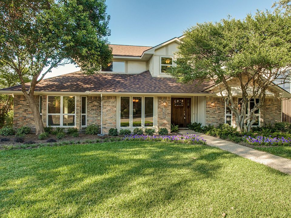 Beautifully updated home in desirable school districts! This Prestonwood home has a charming, warm stone fireplace, a built-in desk area between kitchen and a second living space, and hard surface flooring throughout the first floor. Beautiful neutral colors, and thoughtful details. Jack and Jill configuration upstairs for 4 bedrooms and 2 bathrooms, and an inviting pool. Walk-in master closet, double sinks, granite counter tops throughout.