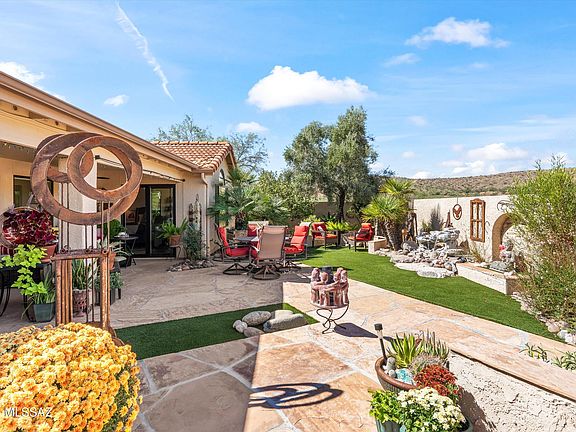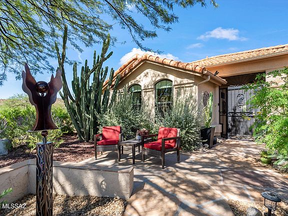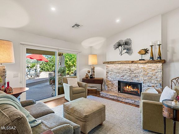 Exquisite 2BD/2BA +Den (2,137 sq ft) Topaz model on corner, cul-de-sac lot has been HIGHLY UPDATED inside & out and backs to a hill for ultimate privacy. Front flagstone patio and iron gated porch flow to a formal living/dining room with open concept family room and kitchen beyond. Showcasing an elegant interior boasting vaulted ceilings, plantation shutters and large picture windows throughout, this home has been updated with Luxury Vinyl Plank flooring throughout, quartz countertops in kitchen & baths, new windows & doors including custom entry door, plus fireplace with impressive stacked-stone surround, mesquite mantel and slab stone hearth in family room off patio. Chef's kitchen hosts ample cabinet and counter space, stainless appliances, breakfast bar, dining nook with bay window, and wraparound counter with built-in wine rack. Den with dual barn door entry features built-in bookshelves with workstation. Elegant Owner's Suite off rear patio hosts a luxury bath with tiled walk-in shower and a walk-in closet while Guest bath offers a deep-set tub/shower. Spacious laundry lies off extended garage housing built-in cabinets, utility sink and epoxy coated floor. Retreat to a relaxing covered patio and tranquil rear yard boasting flagstone pavers, outer raised patio, trickling fountain, decorative turf lawn, plus lush vegetation with fan palms, shade and citrus trees. Enjoy front & rear peeks of the Catalinas from SaddleBrooke's Premier Active Adult Golf Community.