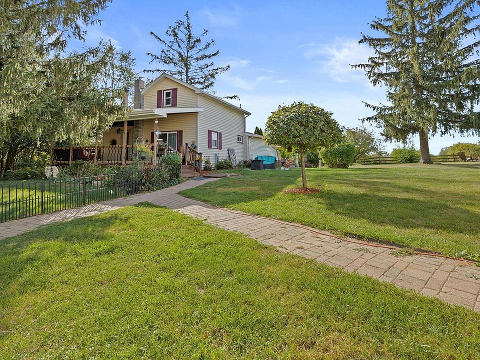 A love for the land, animals, family and friends has been cherished by the owners of this hobby farm for over 40 years! You will enjoy the serenity of wildlife and birds from the covered front porch. Wonderfully updated kitchen with granite countertops, tiled backsplash, island breakfast bar and sliding glass doors to yard. Hardwood floors throughout living room and kitchen. Living room has a wood burning fireplace and handmade sliding barn door to upper bedrooms. Convenient first floor laundry. Updates include a newer poured concrete foundation (2011), 200 amp electric, new roof on front barn & house 2021. Detached 6 car garage (2006). Grocery prices may be rising but you'll grow your own Asparagus, pears, apples and cherries to get you started. Begin your dream and story here!!
