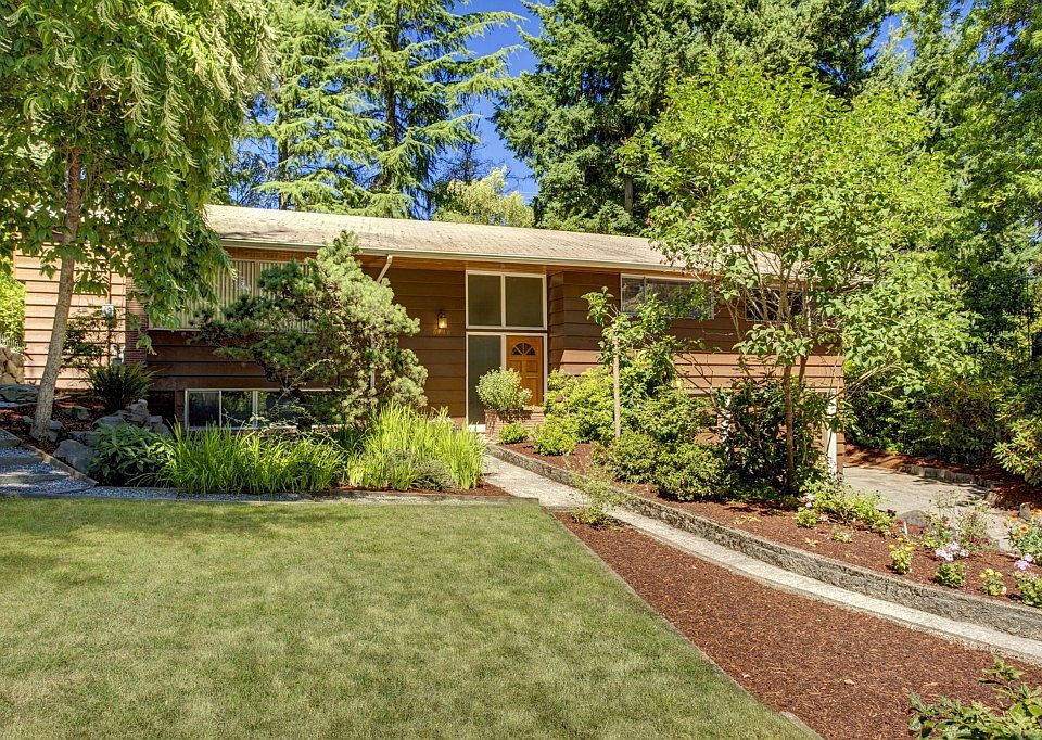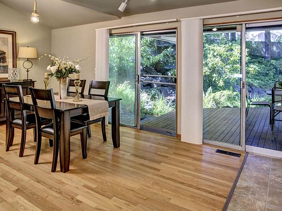 Mid century modern vibe welcomes you. Living room is sleek with hardwoods, and corner glass plus stone faced gas fireplace. Open plan features wonderful dining room w/vaulted ceiling, double sliders adjacent to pretty covered deck with nearby pond. Fully fenced private yard. Comfortable kitchen w/eating bar, flat top range, solid oak cabinets. Large rec room w/fireplace and 3/4 bath adjacent. Huge laundry and storage rooms round out the downstairs. Make this yours!