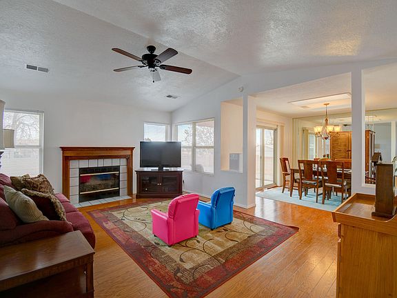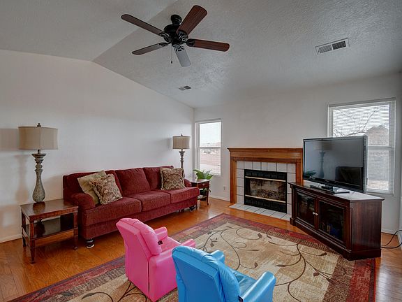 Welcome to River's Edge! This charming home features 3 bedrooms and 2 full bathrooms. A cozy living room with a wood burning fireplace. A delightful dining area. The kitchen has ample cabinet space, and a breakfast nook. The finished 2 car garage has extra space for a workbench or whatever you're into. The spacious backyard backs an open arroyo, has Sandia mountain views, a storage shed, and side yard access with an RV pad. All kitchen appliances, are included, as well as the Ring camera.Conveniently located near shopping centers, entertainment, restaurants, parks, and river trails, this well maintained home ensures quick access to everything you may need and want. Ask your preferred realtor for a full amenities list. Don't miss out, schedule your showing today.